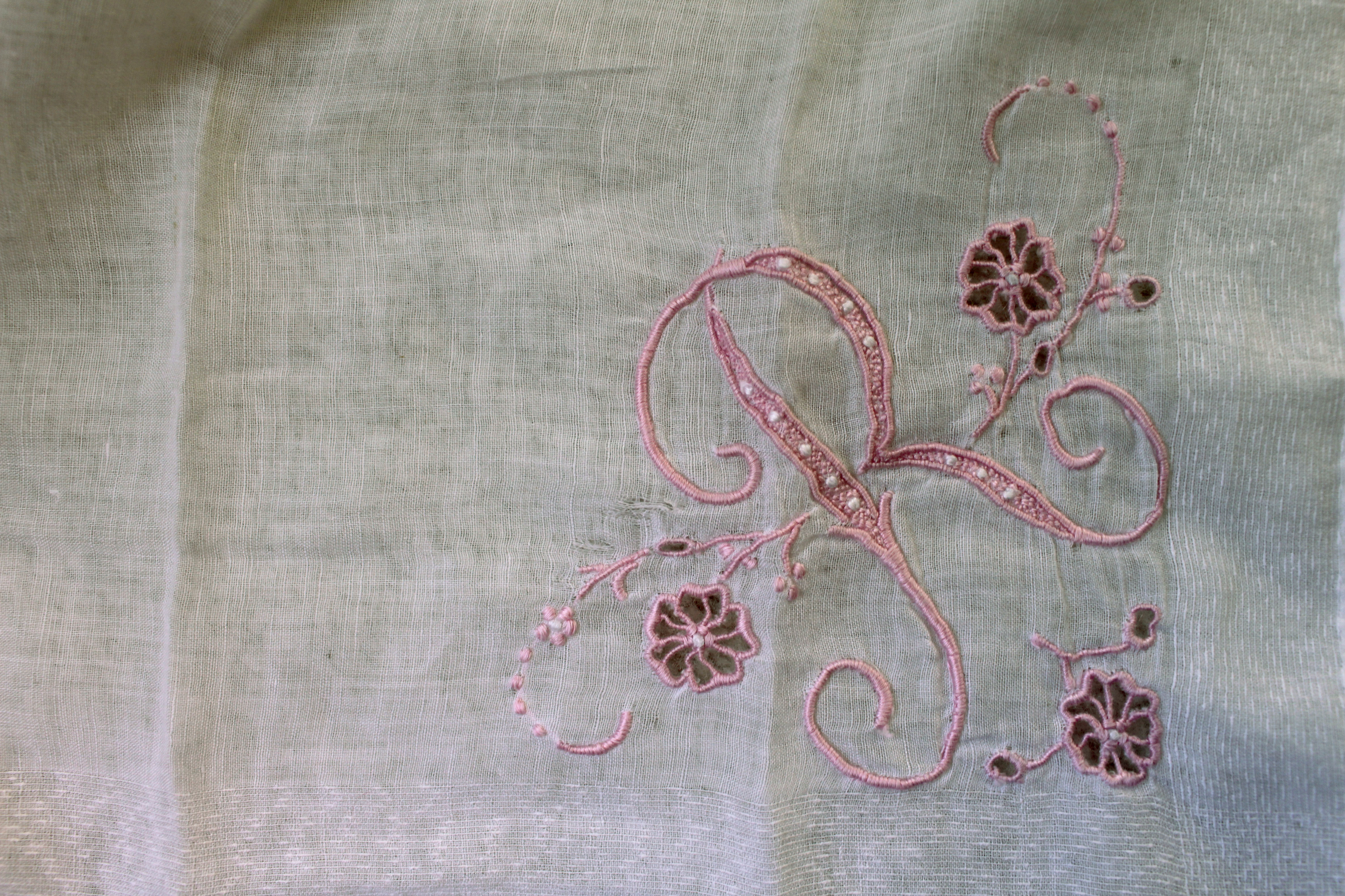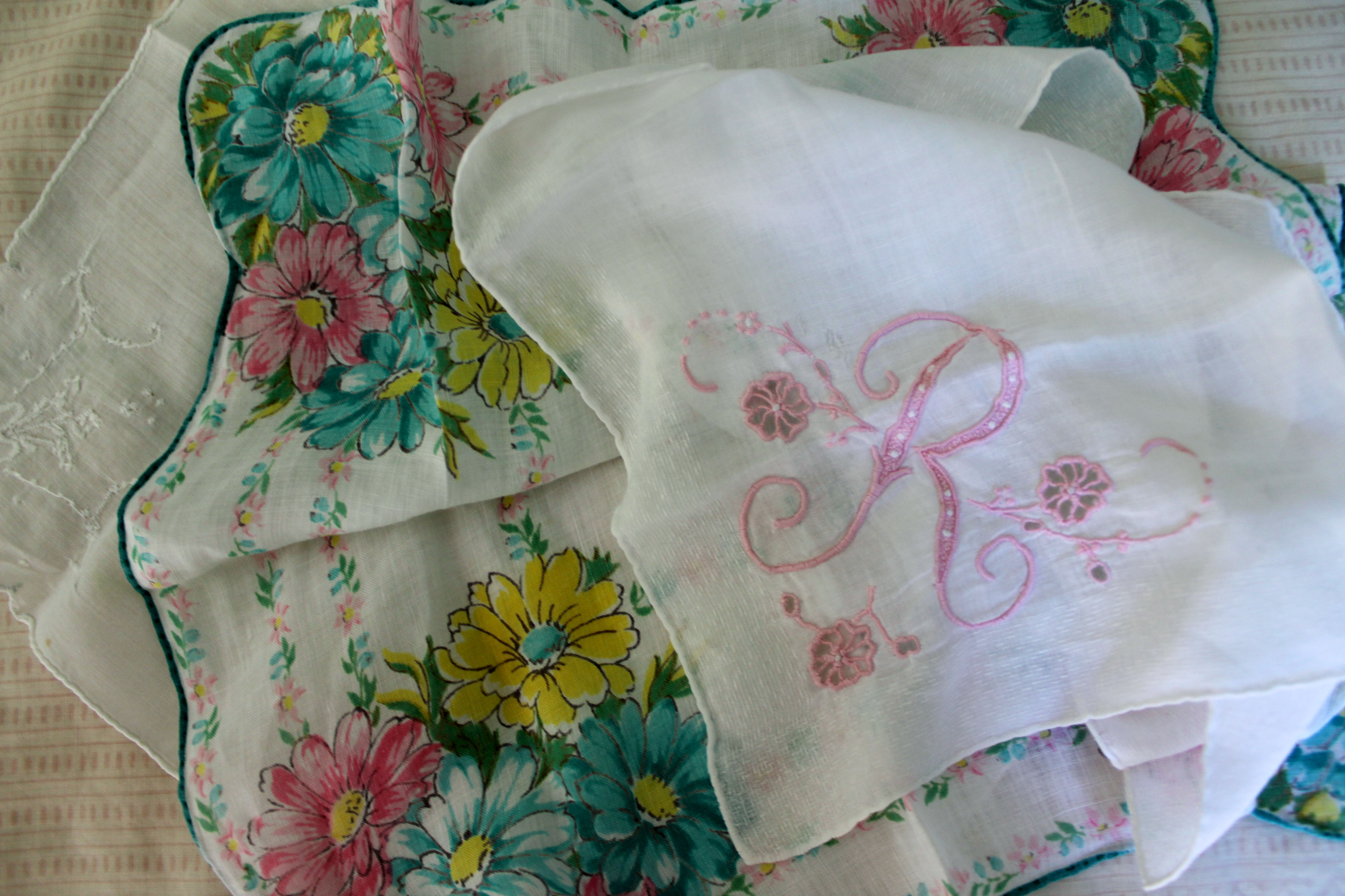 These are the handkerchieves I got from my grandma Moni for my birthday. My great grandmother Nanny Reams embroidered the “R” on the top one. I think they are wonderful. I’m planning to frame them when I have a room of my own.